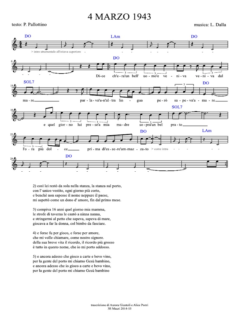 4 marzo 1943 è un brano inciso nel 1971 da lucio dalla e pubblicato lo stesso anno con l'album storie di casa mia, a seguito della sua partecipazione al festiva di sanremo in cui si era classificato terzo; In quell'occasione fu presentato dal cantautore assieme agli equipe 84. Dice che era un bell'uomo e veniva, veniva dal mare. E quel giorno lui prese mia madre e ancora adesso che gioco a carte e bevo vino per la gente del porto mi chiamo gesù bambino.